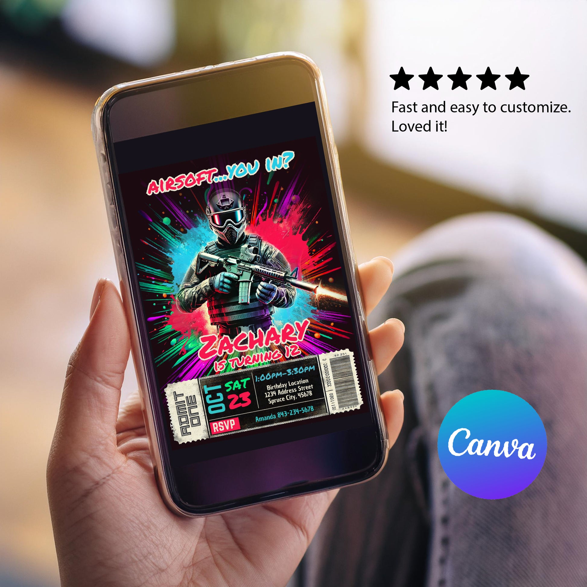 Prepare for an epic Airsoft-themed celebration with our customizable Airsoft Birthday Invitation! Perfect for young sharpshooters and thrill-seekers, this energetic invite sets the tone for an unforgettable birthday party. Personalize your details and let the fun begin! Downloadable and printable, these invitations make it easy to gather your squad. Ideal for kids and teens who love airsoft battles. Get ready to blast into action and make memories that will last a lifetime! Order now and bring your Airsoft birthday vision to life!