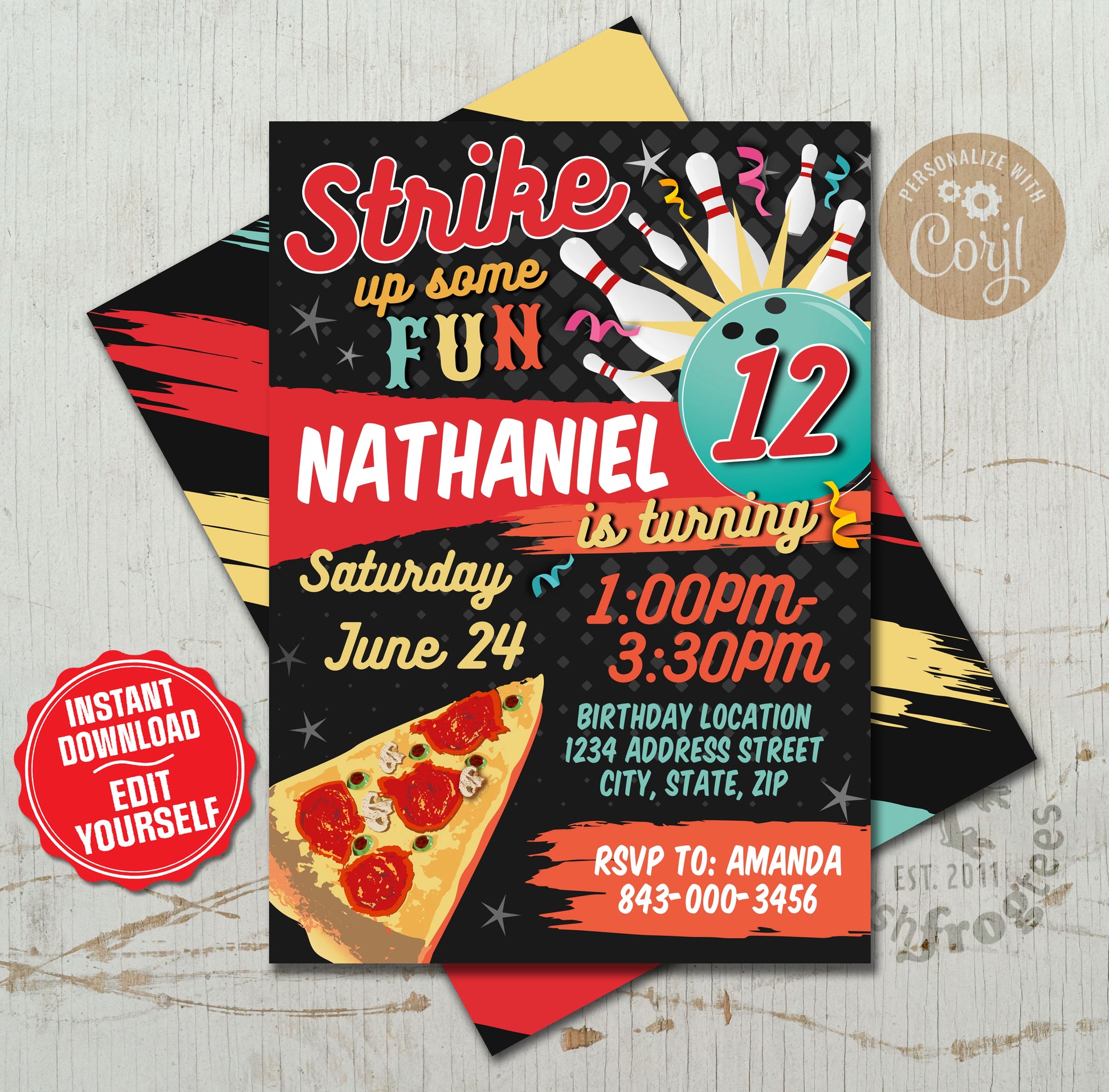 Editable Bowling Pizza Birthday Party Invitation instant download.