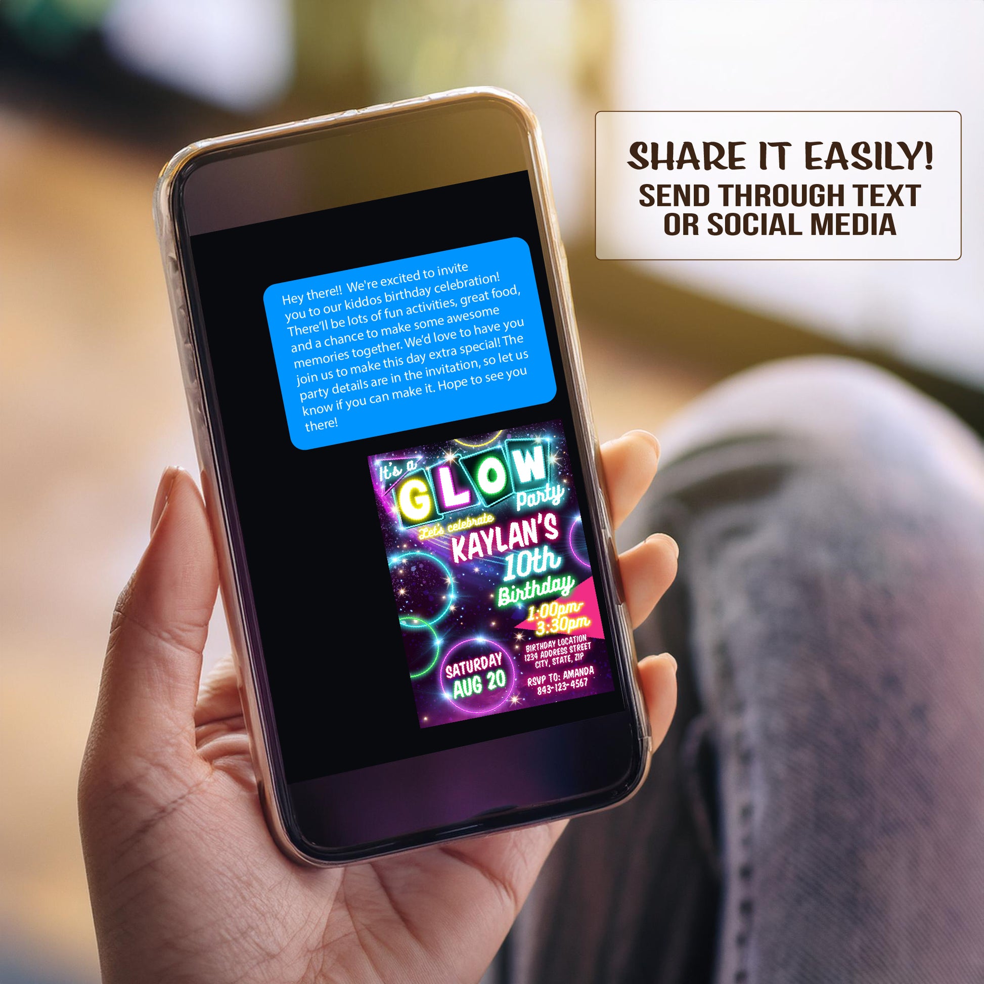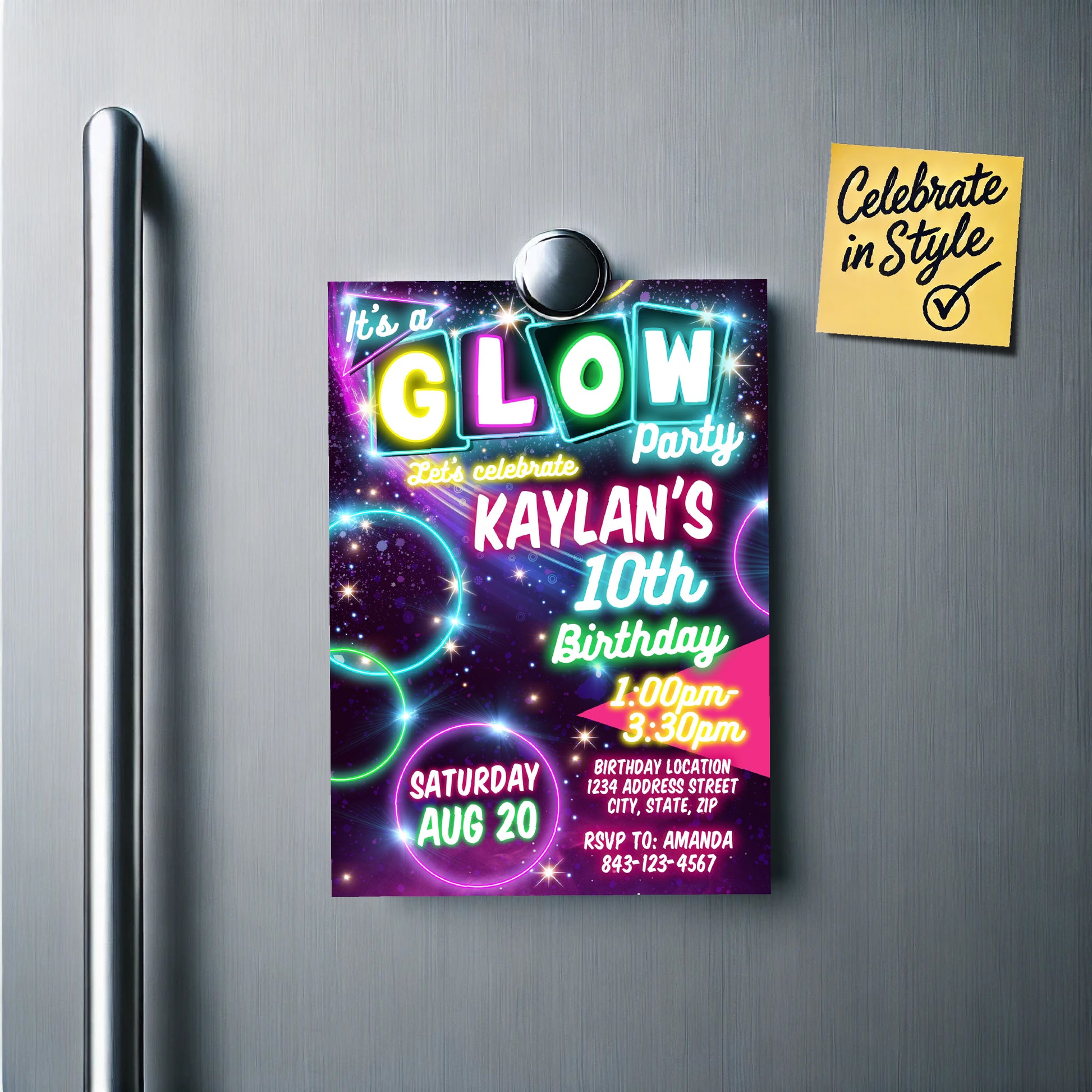 Light up the night with our Glow Party Birthday Invitation! This electrifying invitation is perfect for a neon-themed birthday celebration that promises vibrant colors and glow-in-the-dark fun. Ideal for kids and teens, this invite is designed to set the stage for an unforgettable party, whether it's a Glow Dance Party, Neon Pool Bash, or a Let's Glow Crazy celebration. Fully customizable with your event details, this invitation is a must-have for those looking to create a high-energy atmosphere and wow their guests from the start. Get ready to party in neon style!