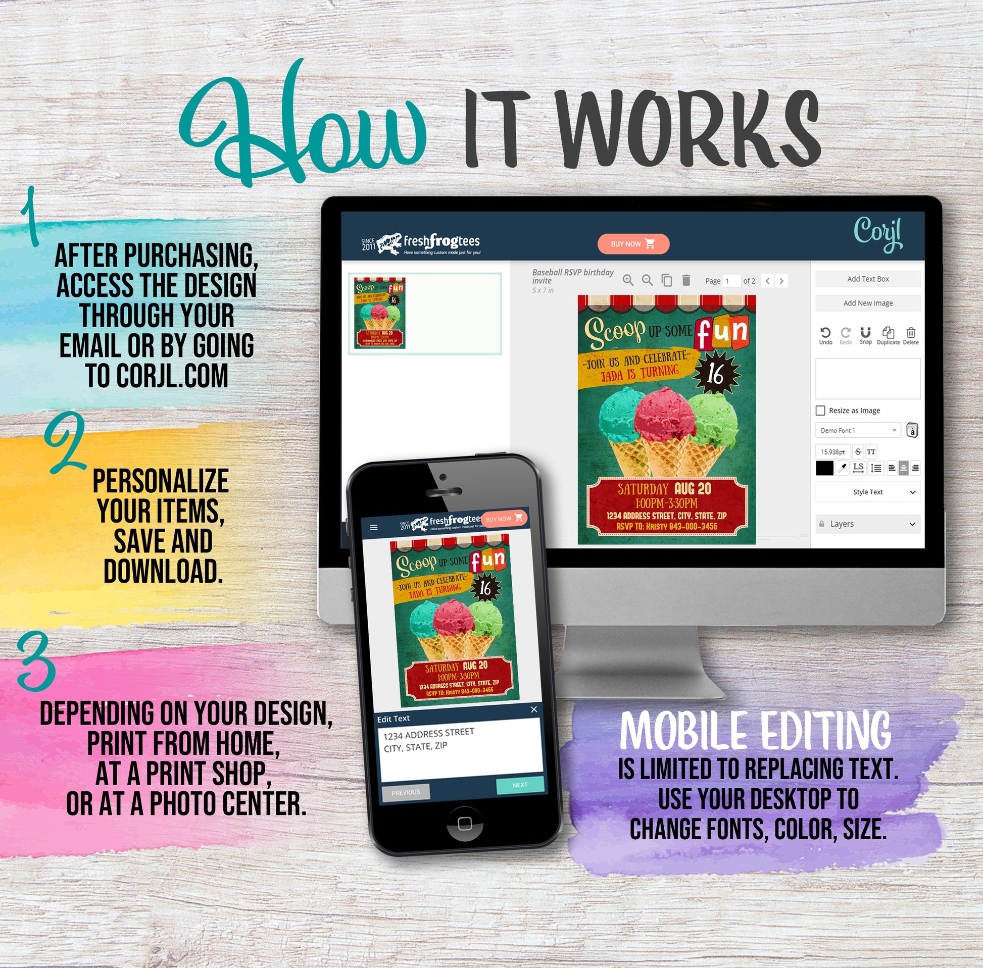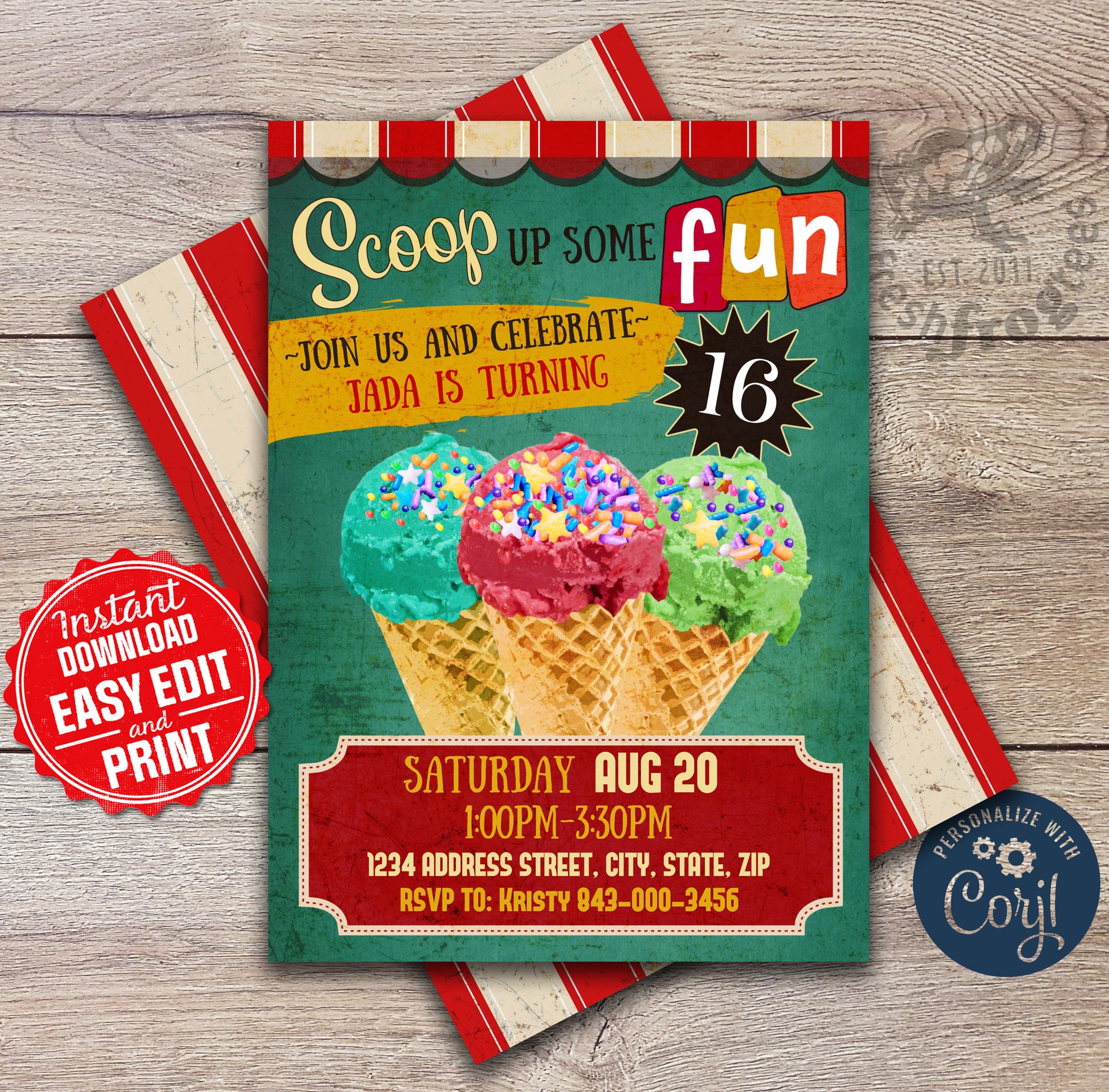 Editable Vintage Ice Cream Birthday Party Invitation instant download.