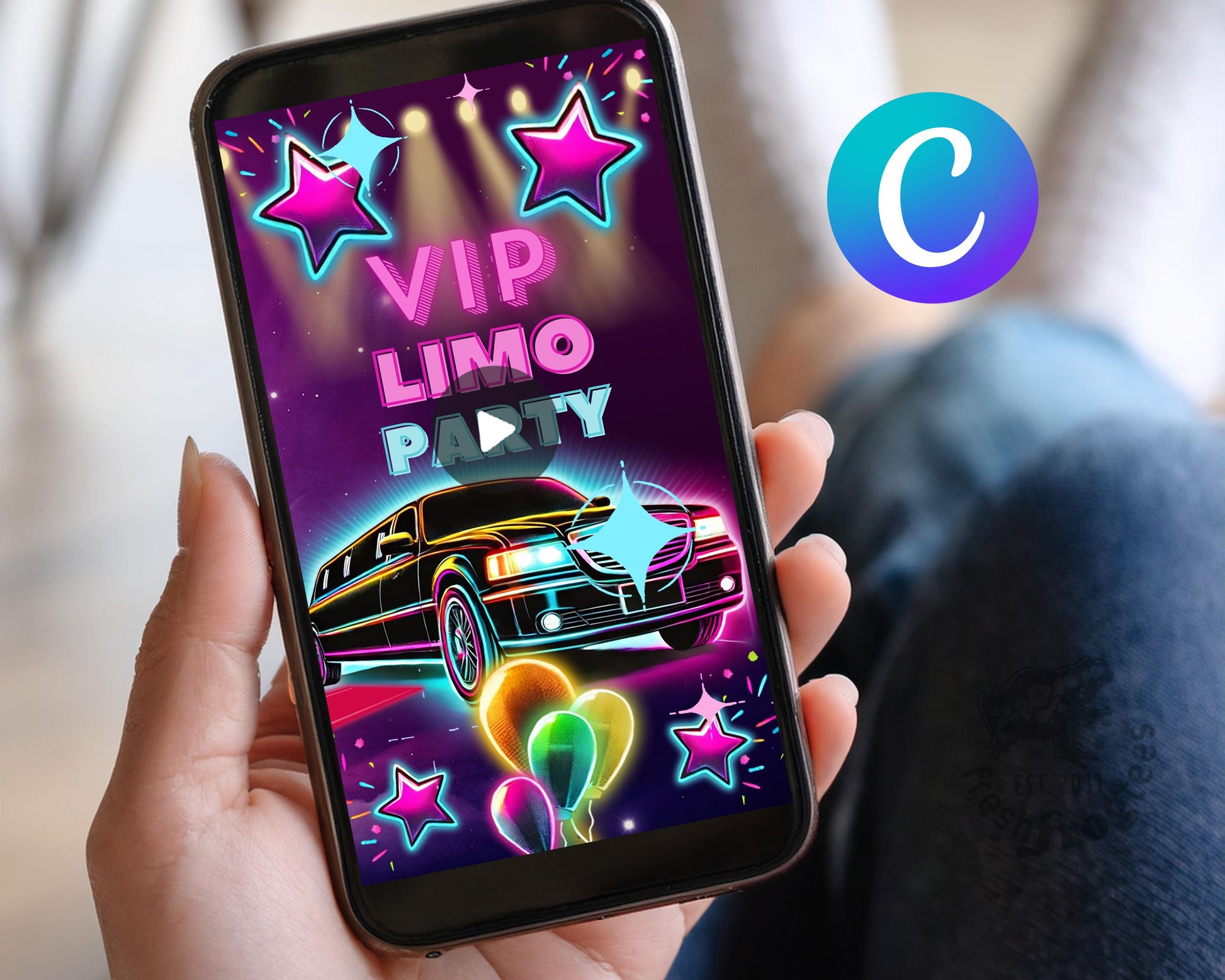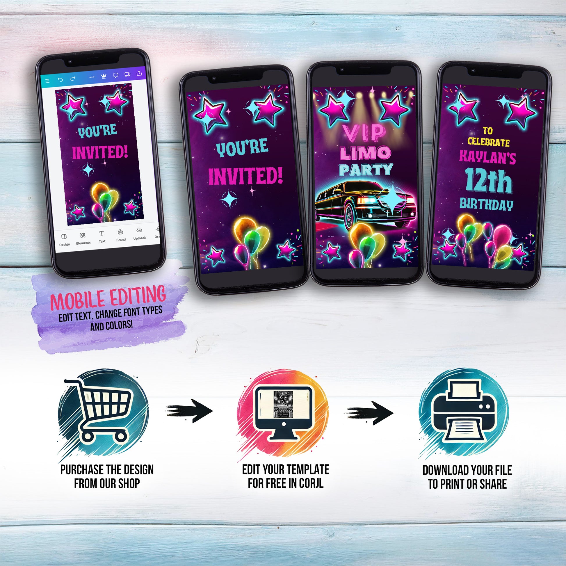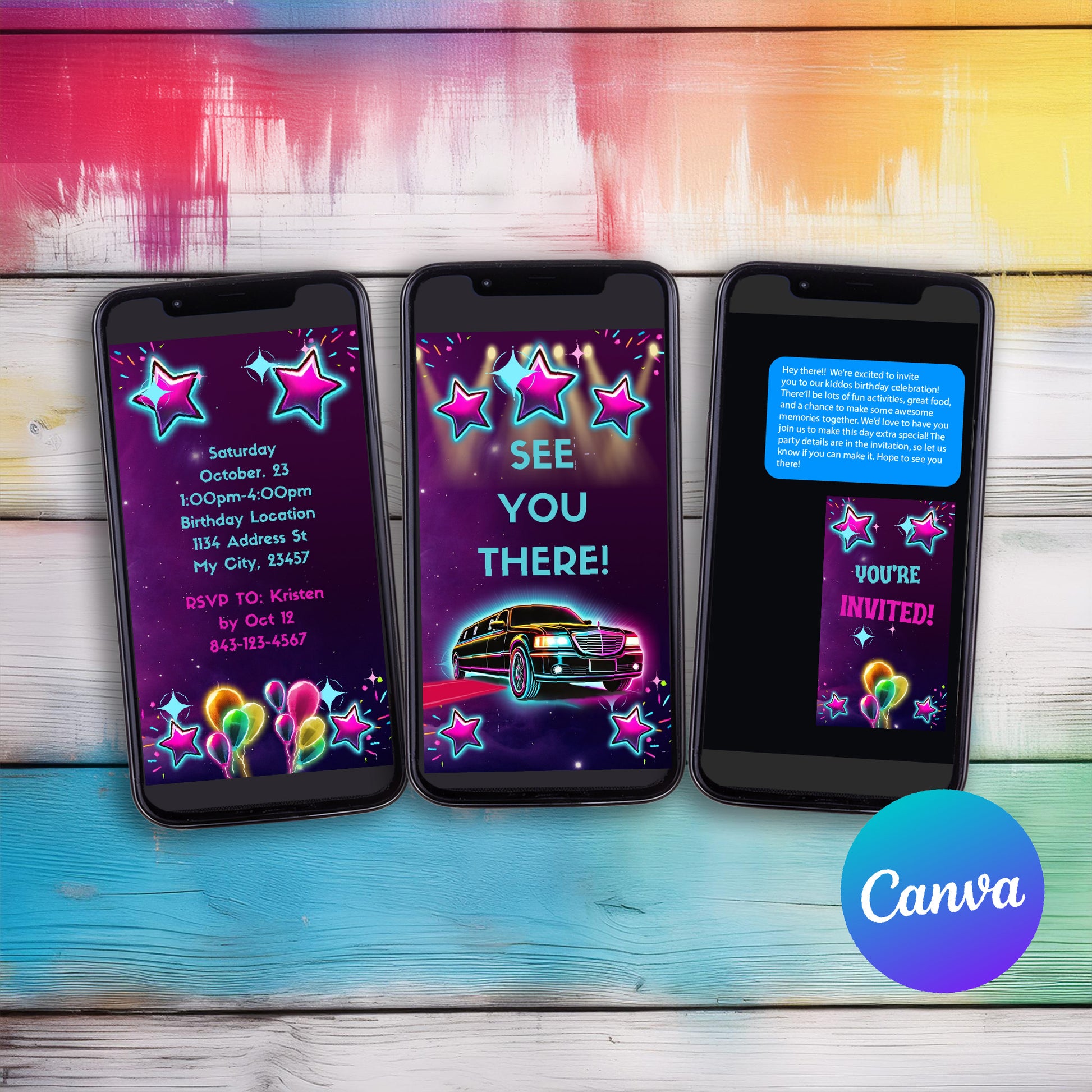 Celebrate in style with our vibrant Limo Party Invitation—the perfect choice for a luxurious and fun limo-themed birthday celebration! This digital limousine birthday invitation features a sleek black limo outlined in neon lights, creating an exciting and exclusive VIP vibe that sets the tone for an unforgettable event. With bold neon colors like pink, teal, yellow, and purple, this invitation screams energy and excitement for both kids and teens.