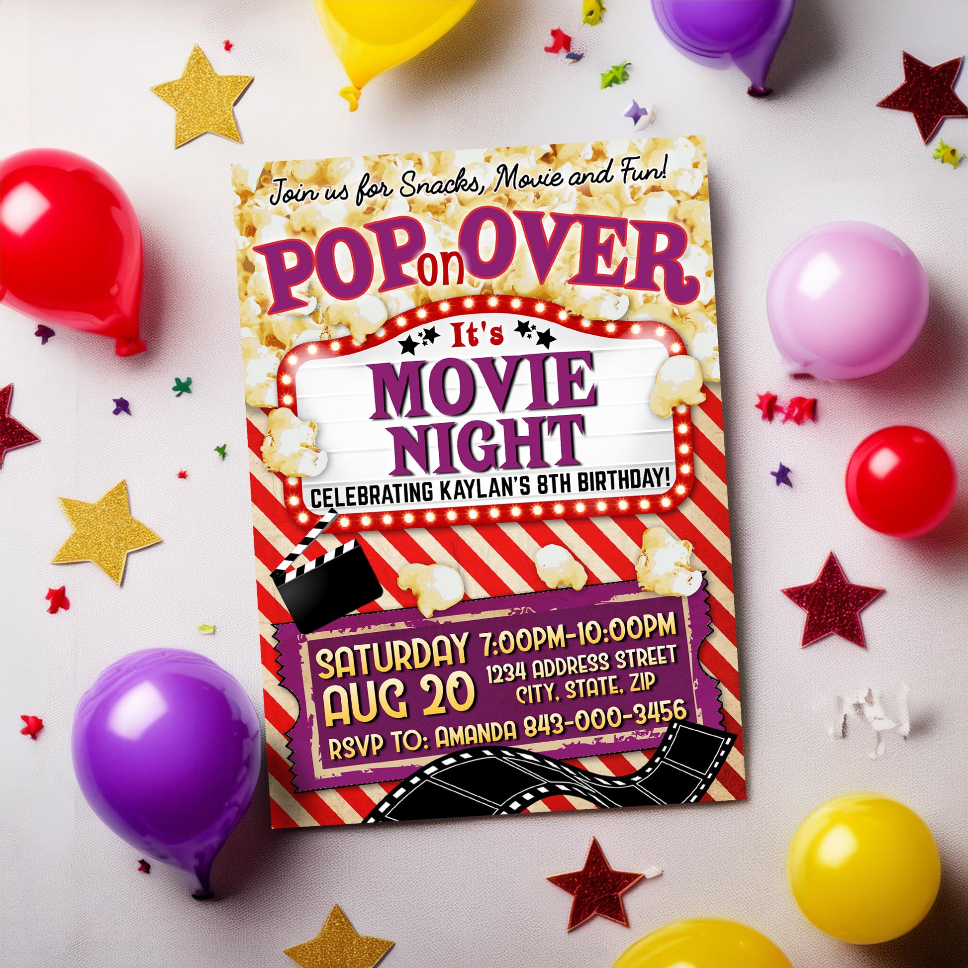 Set the stage for a blockbuster birthday bash with our customizable movie night birthday invitation template! Featuring popcorn, film reels, and starry accents, personalize it effortlessly for a memorable celebration. Instant download available!