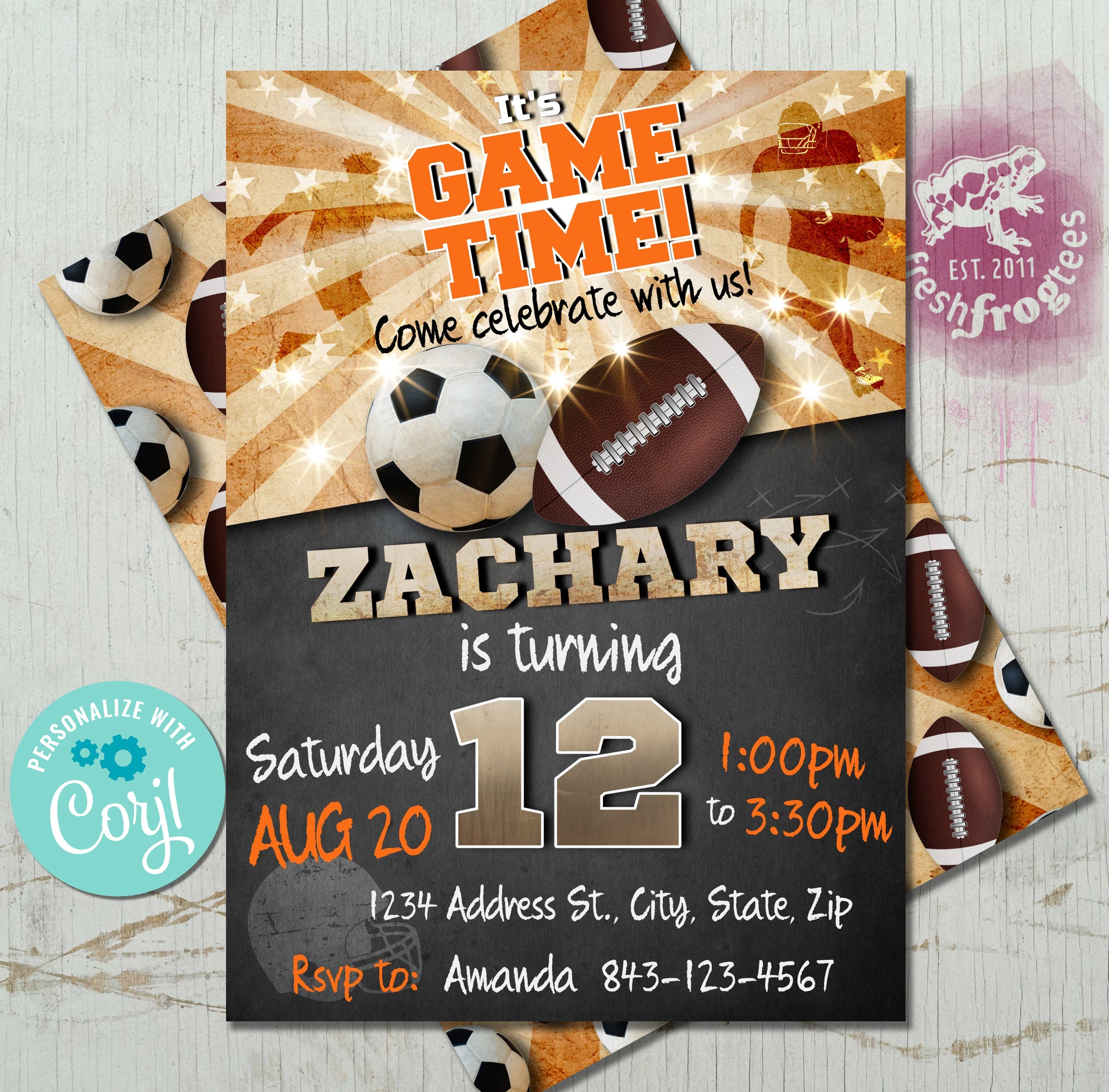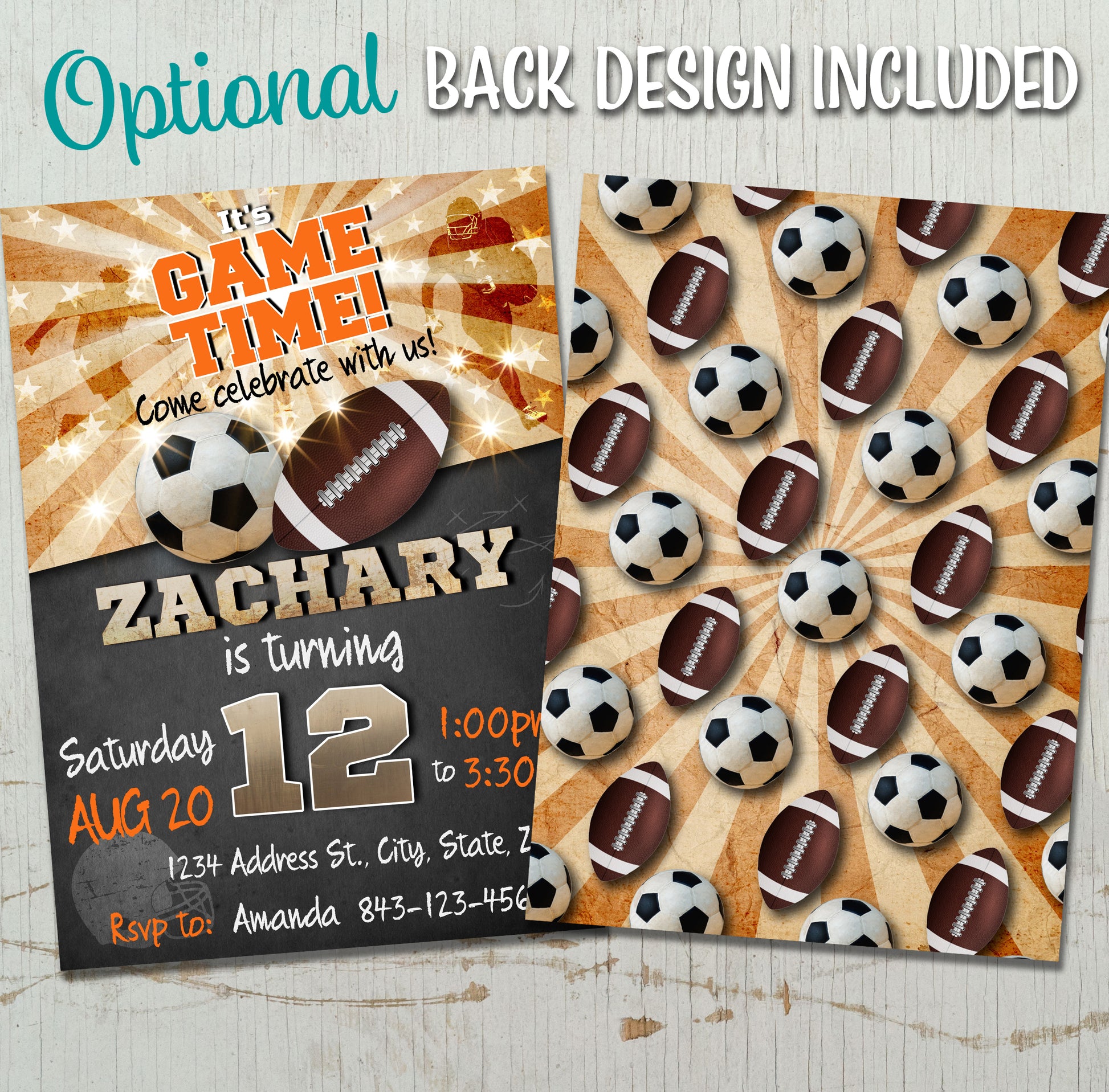 Celebrate your little athlete's special day with these sporty and fun soccer and football birthday invitations! Perfect for a sports-themed party, these invitations feature vibrant colors and playful designs that will get your guests excited for the big game. Whether your child loves kicking around a soccer ball or throwing a touchdown pass, these invitations are sure to score a goal with all your party guests. Customize the details to fit your celebration and get ready to kick off the festivities in style!