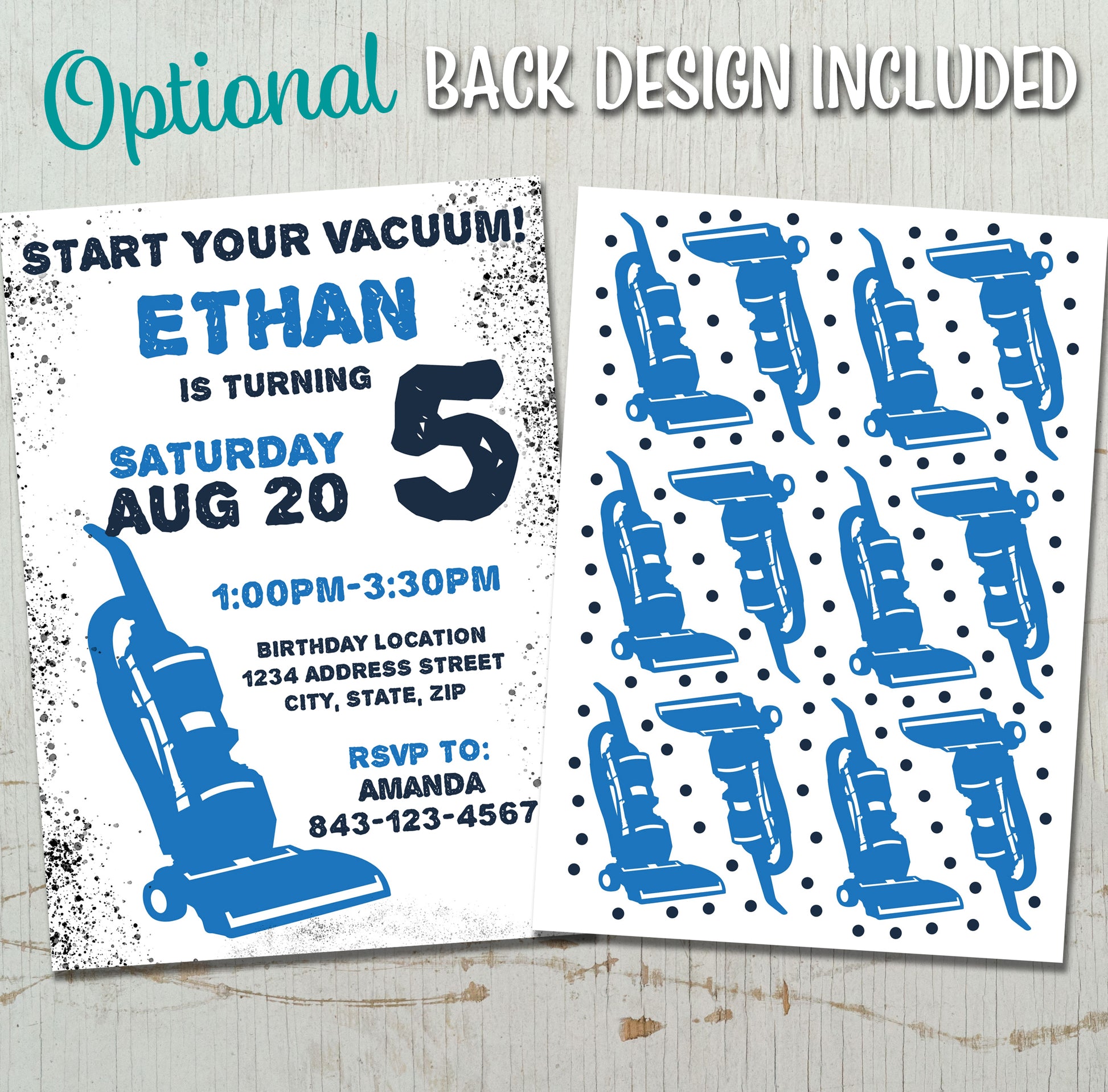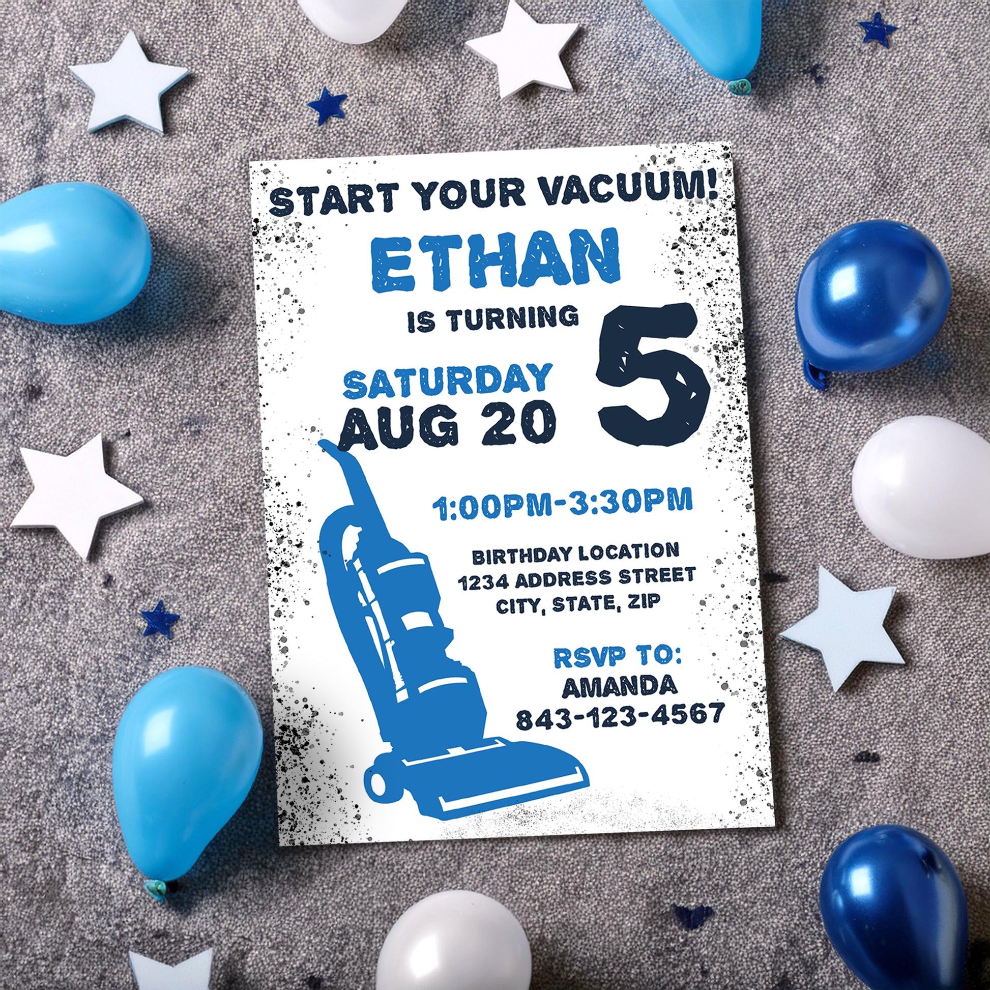 Vacuum cleaner birthday invitation kids rsvp editable digital invite BLUE
